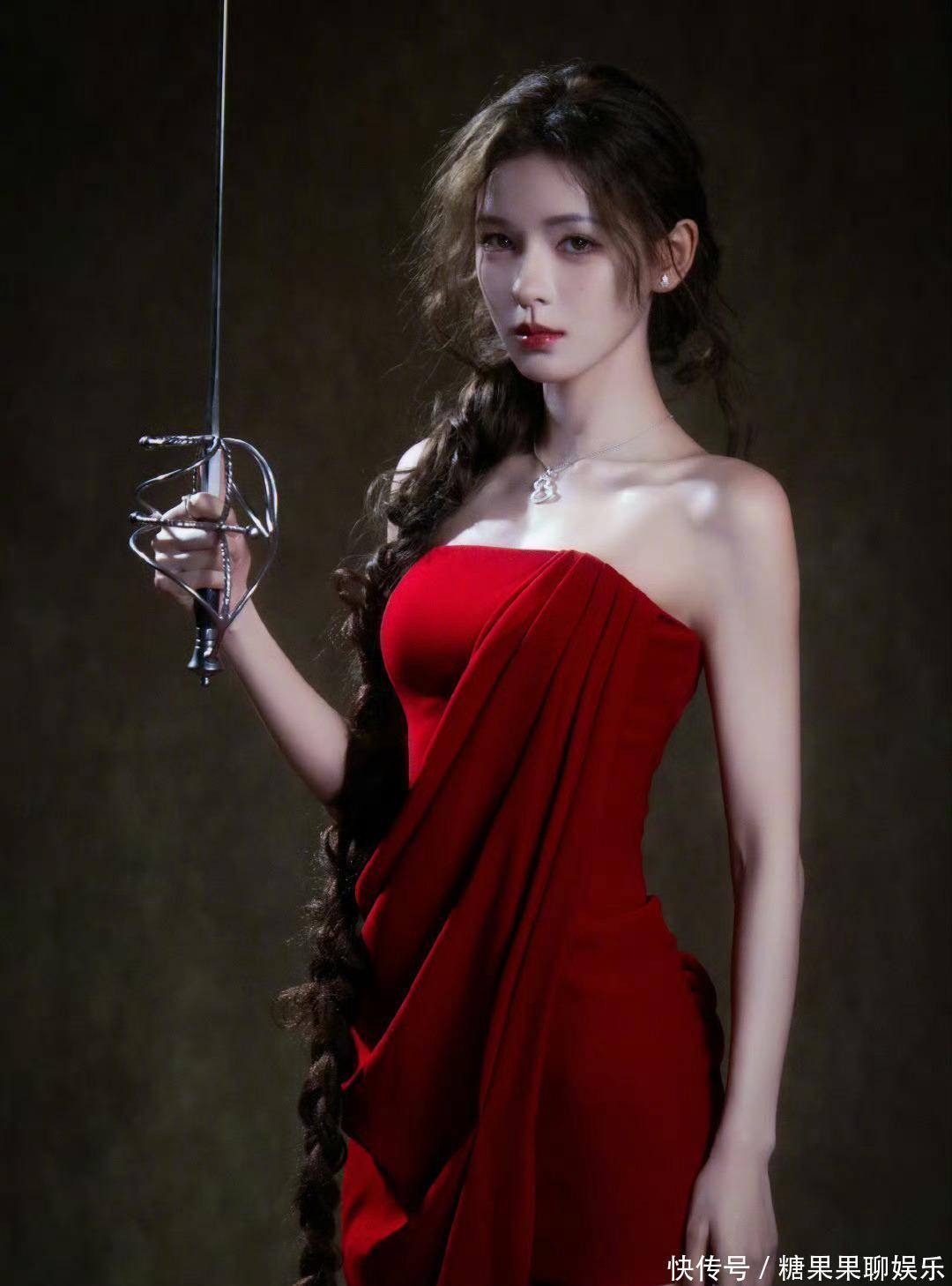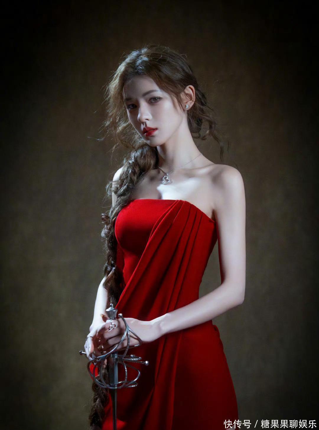 近距离看,她的五官真的很精致,鼻子高挺,眼睛明亮,嘴唇的形状也很好看,涂着和红裙同色系的口红,特别衬肤色。她的皮肤也特别好,在红裙的映衬下,白得像雪一样,让人看了特别羡慕。她的发型是大麻花辫,编得很精致,发尾还有些卷曲,自然地垂在身前,为整体造型增添了几分温柔的感觉。她的动作也很优雅,无论是站立还是坐下,都带着一种从容的美感,拿着长剑的样子,又给她增添了一丝英气,让她的美更加独特。说实在的,张予曦的颜值和时尚感一直都很强,这次的红裙造型更是把她的优点都放大了,既有女性的柔美,又有别样的帅气,这样的她,真的很难不让人喜欢,只能说,她的颜值,我是真的服!